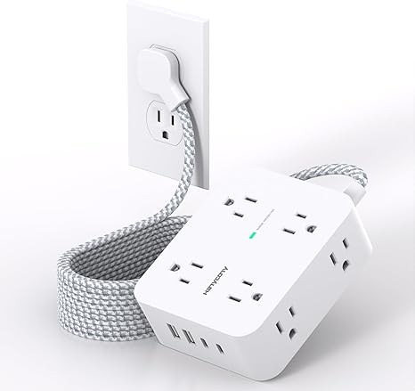 • 【Extension Cord with Multiple Outlets】The HANYCONY long cord power strip features a unique 3-sided design, transforming a single socket into 8 wide-spaced outlets and 4 USB charging ports. This allows you to power up to 12 devices simultaneously without the need for multiple converters. The 2.2-inch spacing between outlets accommodates larger adapters without any obstruction