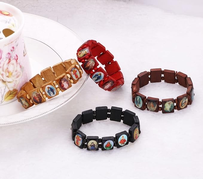 4pcs Wooden Jesus Virgin Mary Bracelet Saints Rosary, Stretchable Wooden Small Panel Bracelet, with Images of Religious Saints Jesus Gift for Men & Women