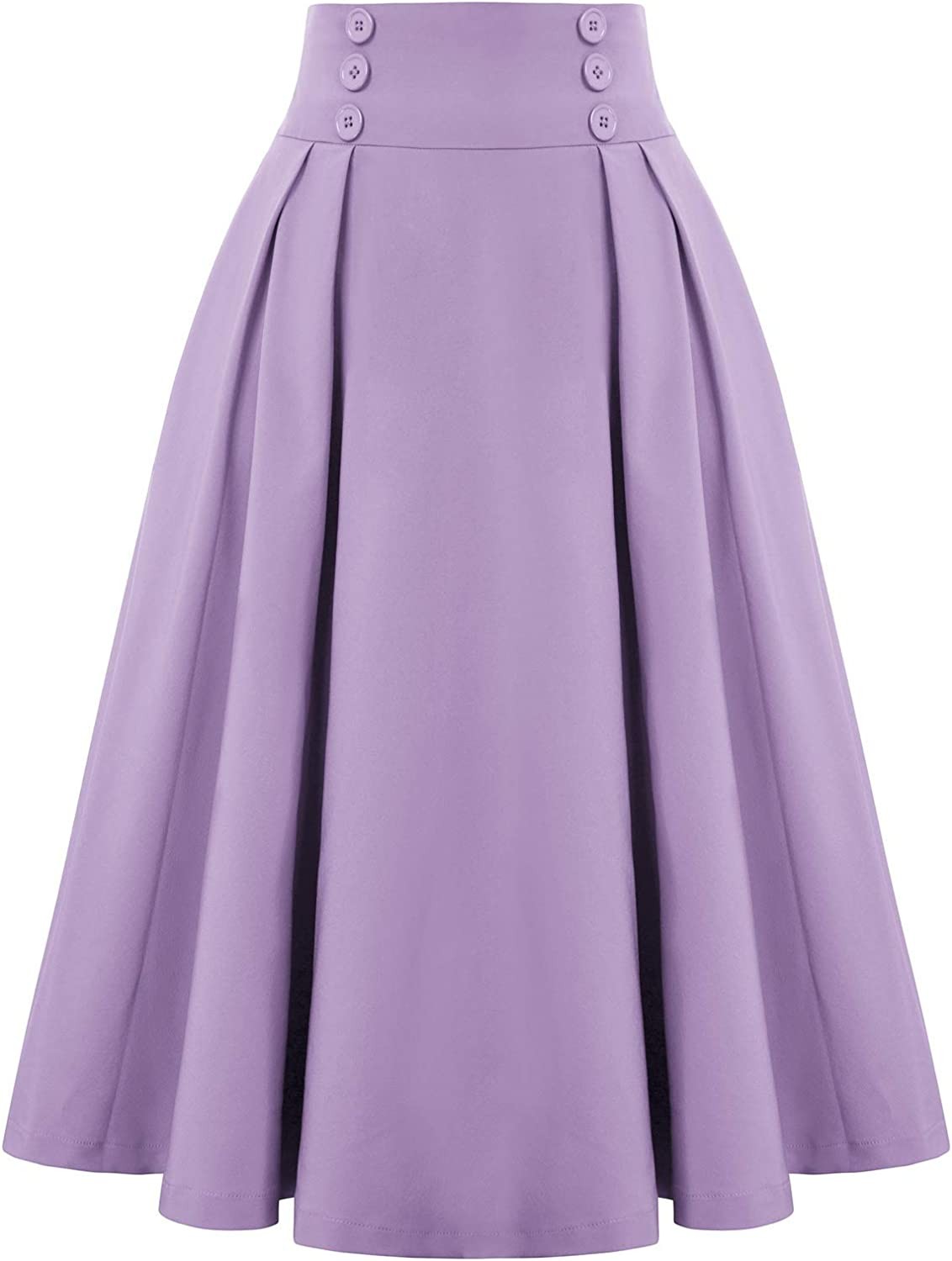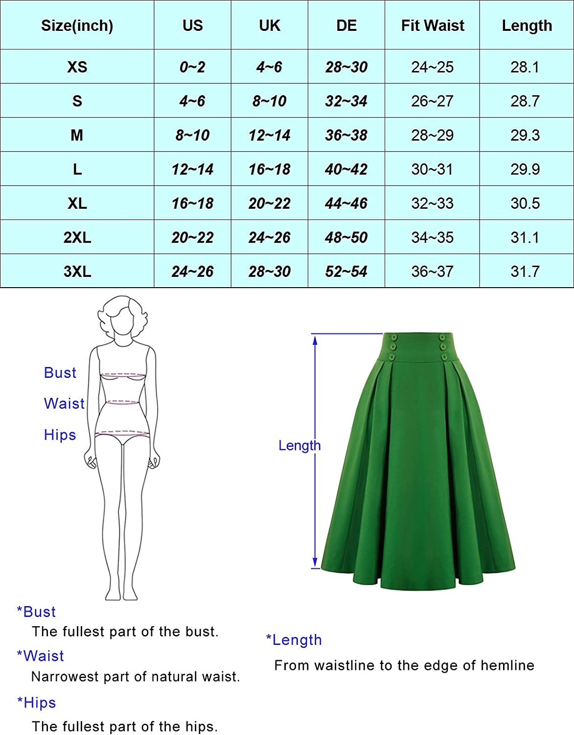 • Features:Pleated skirt midi, flared A line silhouette, elastic waist,6 decoration buttons, with 2 open pockets