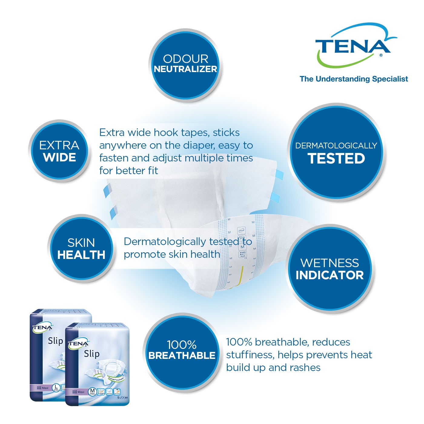 TENA Slip Maxi là sản phẩm chống thấm nước tất cả trong một mở với các tab có thể điều chỉnh để vừa vặn hoàn hảo, thoải mái và chống rò rỉ. Không giống như nhiều loại tã người lớn thông thường, TENA ProSkin Slip có chất liệu mềm mại như vải, vừa vặn với cơ thể và khả năng chống rò rỉ cao, lý tưởng cho những người ít vận động hoặc khi thay tã trên giường. Nhờ chức năng FeelDry Advanced™, sản phẩm nhanh chóng
