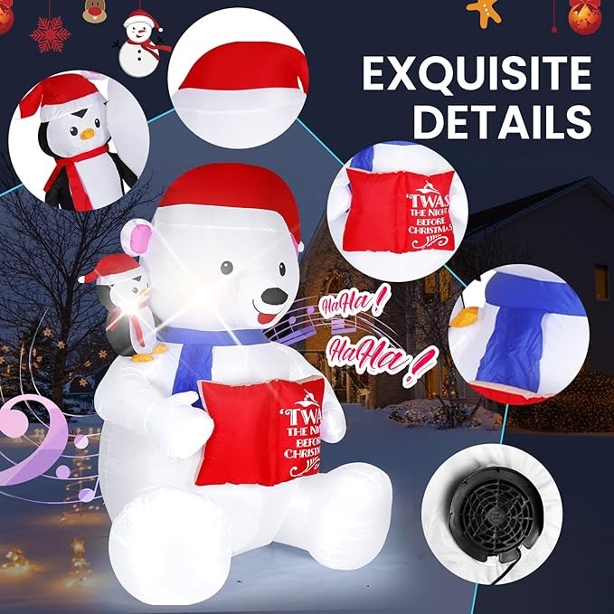 • [Christmas Focal Point]: Elevate your Christmas holiday decor with our stunning Christmas inflatable white bear holding book. The adorable 8-foot-tall mother polar bear engrossed herself in telling a story to a penguin cub on her shoulder. The book tells the story of the origins of Christmas and the related stories. It will attract the attention of your family, neighbors and passers-by, and get countless compliments.