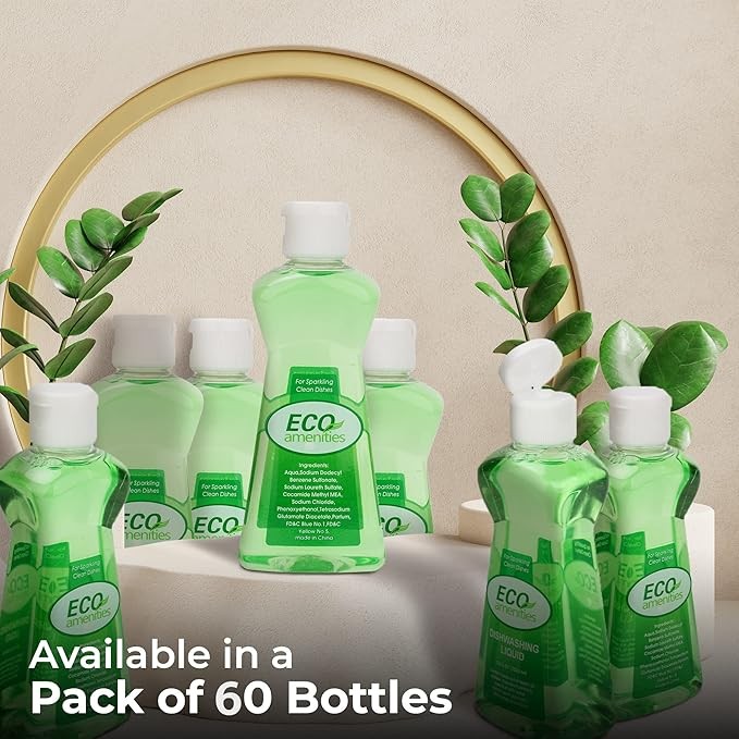 ECO amenities Travel Size Dishwashing Liquid - 60 Pack, 3.5 oz Bottles, Bulk Case of Dish Soap, Individually Packaged Kitchen & Cleaning Supplies, For Guests of Airbnbs, BNBs, VRBO, Inns and Hotels