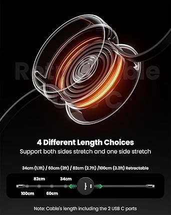 • 【4-Stage Adjustable Length】Fasgear 240W retractable USB C charging Cable offers four stretching lengths: 1.1ft, 2ft, 2.7ft, and 3.3ft. It supports stretching from both sides and one side. High-frequency use in various scenarios in daily life such as travel, business trips, home, etc. Compact and Mini Size design allows for easy storage and portability. This USB C charger cable keeps it tidy and free-tangled when used.
