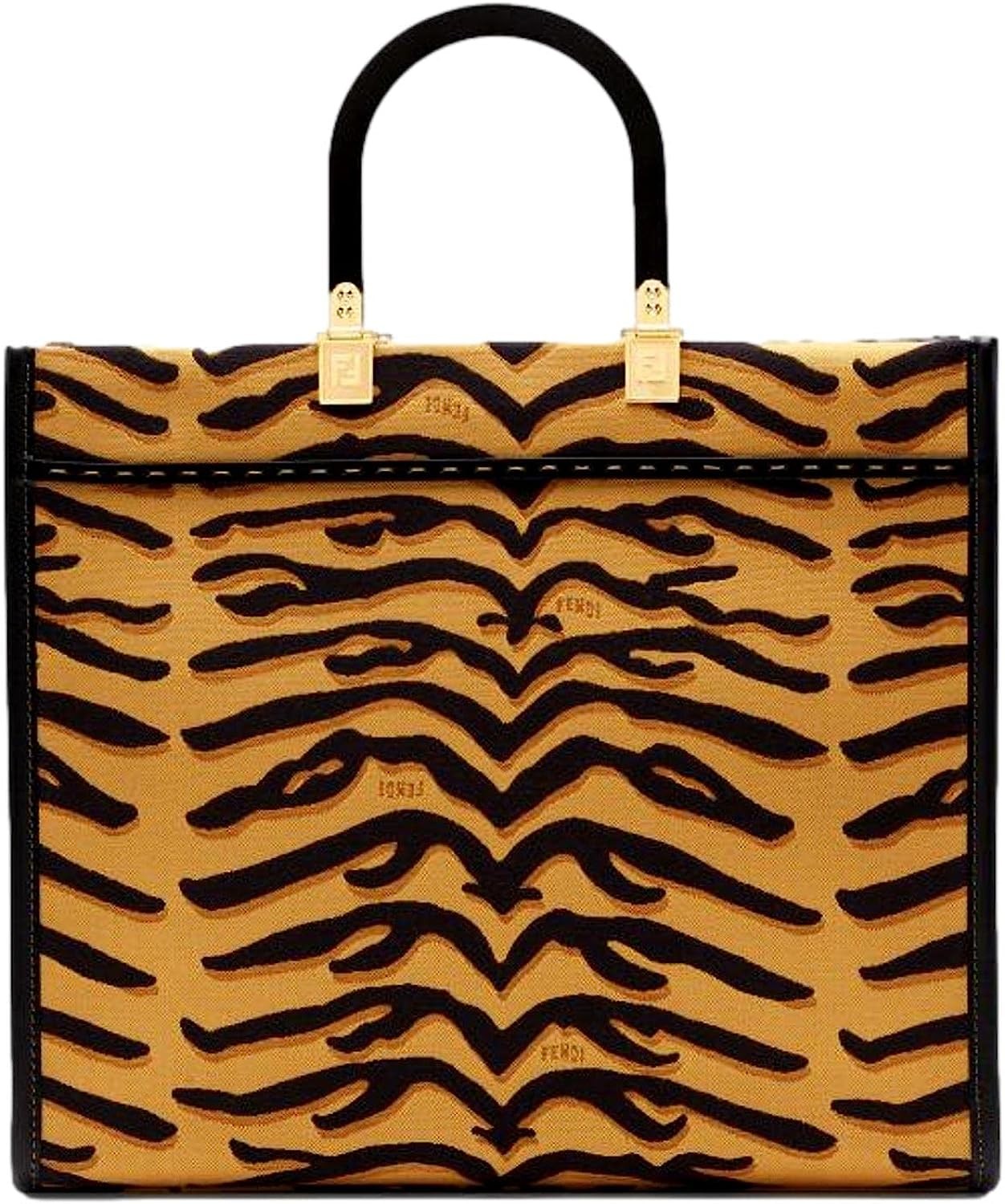 • This Fendi Sunshine Shopper Bag combines classic lines with a bold tiger print in the canvas shopper tote. The designer was inspired by the Chinese Year of the Tiger celebrations and the bold black and yellow colors make the print pop.