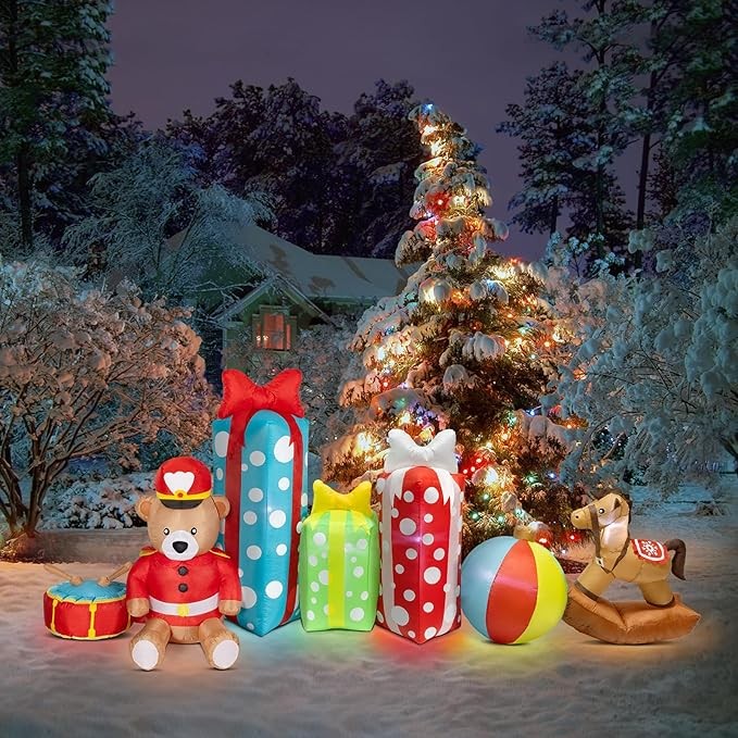 • Charming and Festive Design – This 10.5FT long x 4.3FT tall inflatable display features a delightful combination of a teddy bear soldier, rocking horse, colorful presents, a drum, and a bright beach ball. The playful and eye-catching arrangement brings a joyful holiday spirit to your yard or indoor décor.