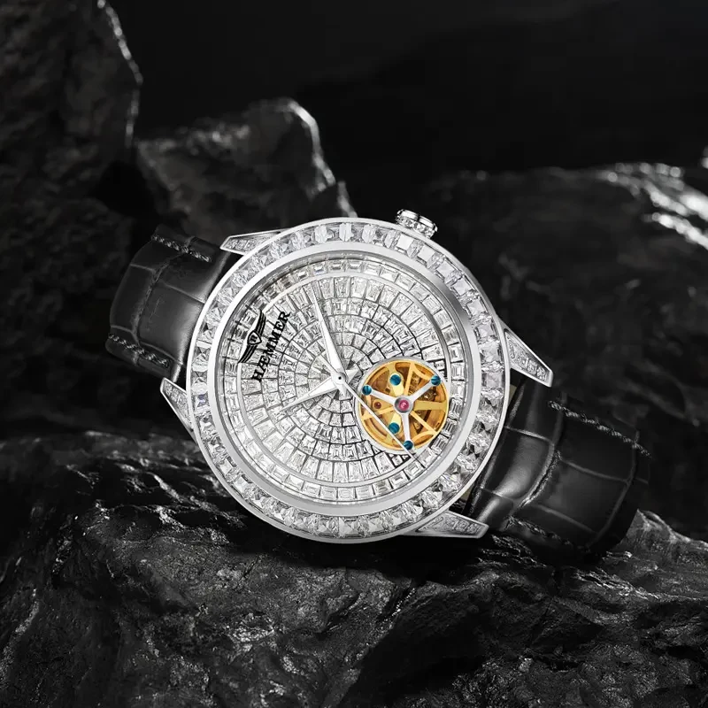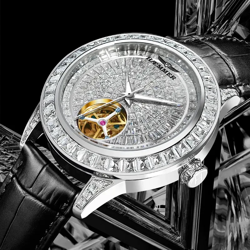 Haemmer 5037 Luxury Handmade Mosaic Diamond Silver Steel Watch Fashion Hip Hop Automatic Mens Watch