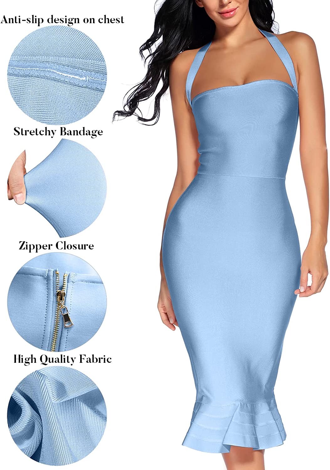 • Design: Sexy halter neck,sleeveless,above Knee Length,mermaid tail dress and zipper back design.(Warm tips: This date night dresses for women may be white mark under the zipper in transit, ironing at low temperature will eliminate white mark.)