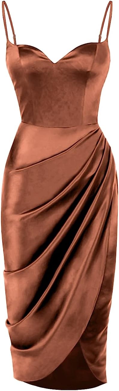 Joukavor Women's Sexy Spaghetti Strap Satin Dress Ruched Midi Bodycon High Slit Dress for Cocktail