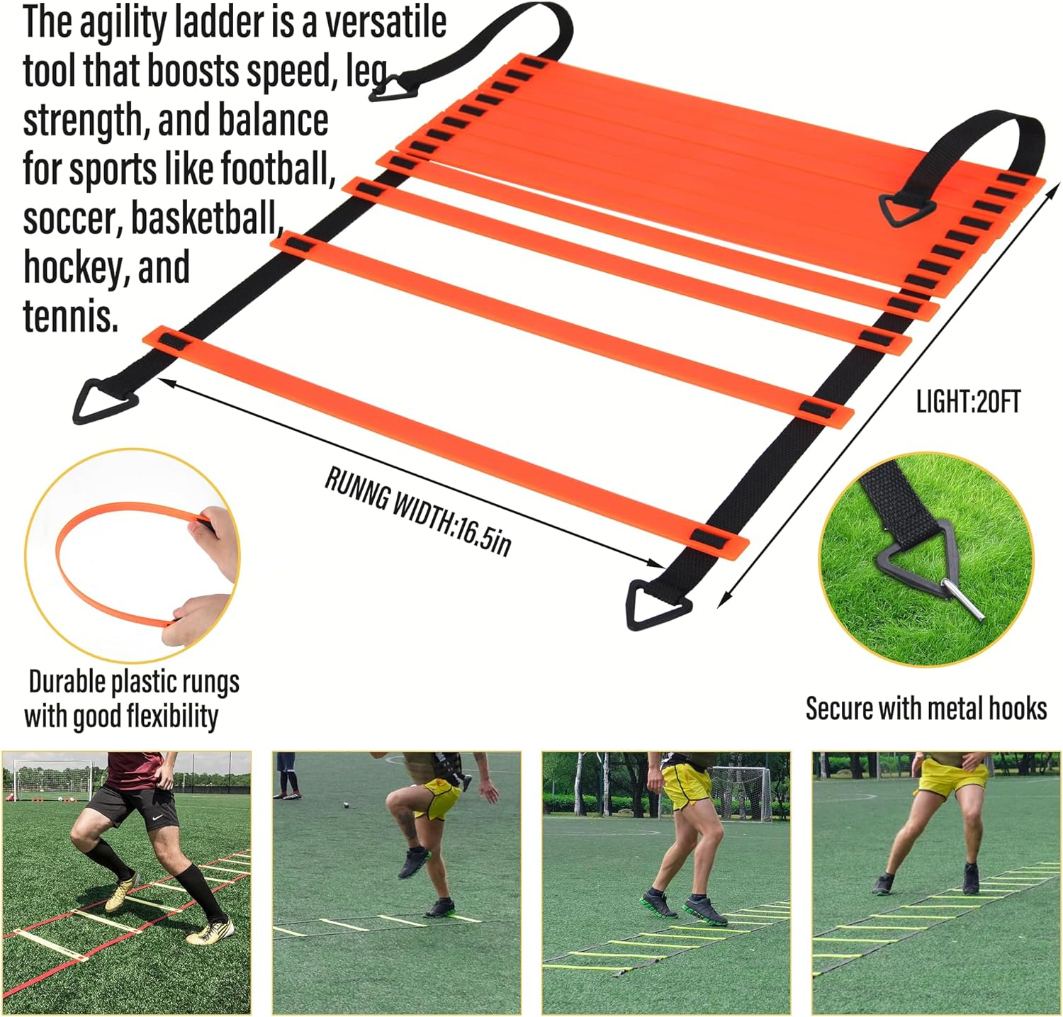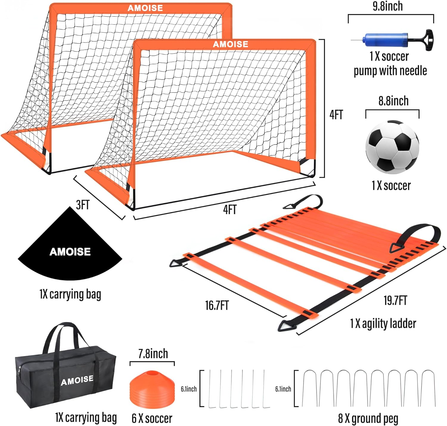 The complete set includes 2 goals, a standard size 4 soccer ball, a pump, an agility ladder, cones, stakes, and 2 carrying bags.