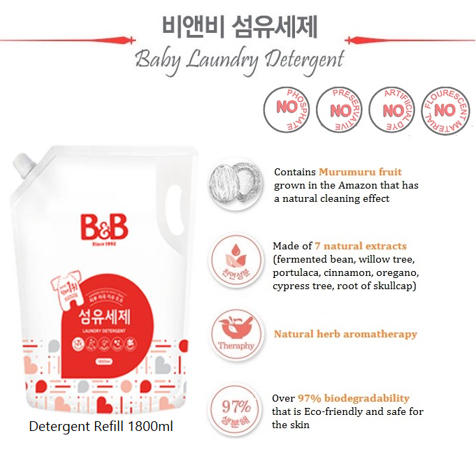Chất tẩy rửa cho trẻ em không gây dị ứng và không chứa hóa chất của B&B giúp bảo vệ làn da mỏng manh của bé khỏi tình trạng kích ứng da và phát ban với công thức dịu nhẹ và hiệu quả. Chứa quả Murumuru được trồng ở Amazon, giúp làm sạch vải cho bé một cách tự nhiên. Công thức không gây dị ứng của chúng tôi được bổ sung thêm mùi hương thảo mộc tự nhiên, giúp xoa dịu tâm trí và cơ thể thông qua liệu pháp hương thơm.
