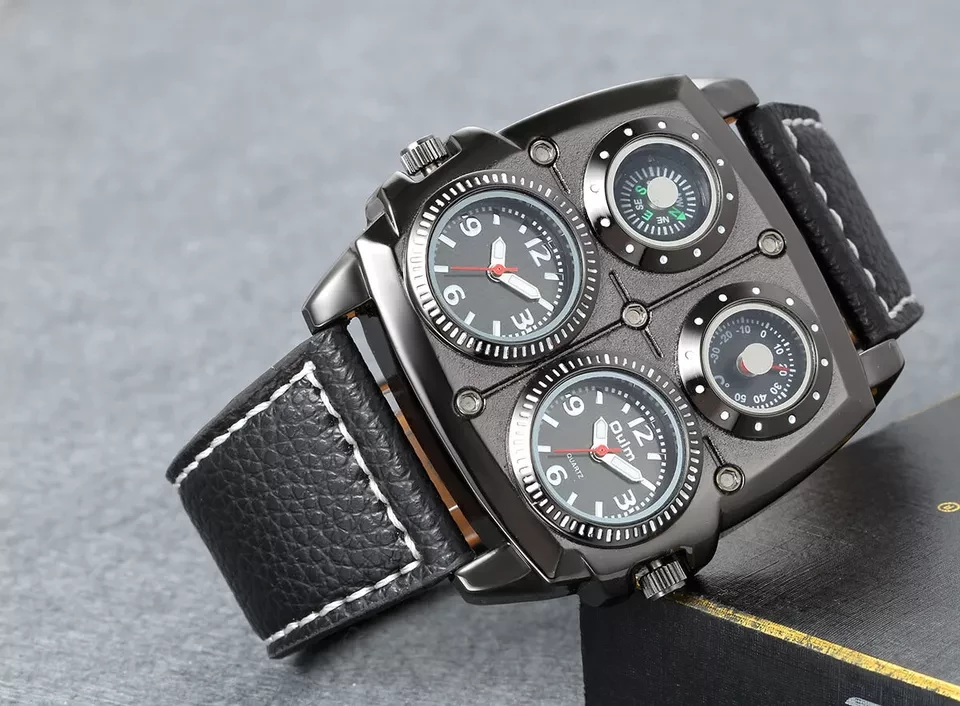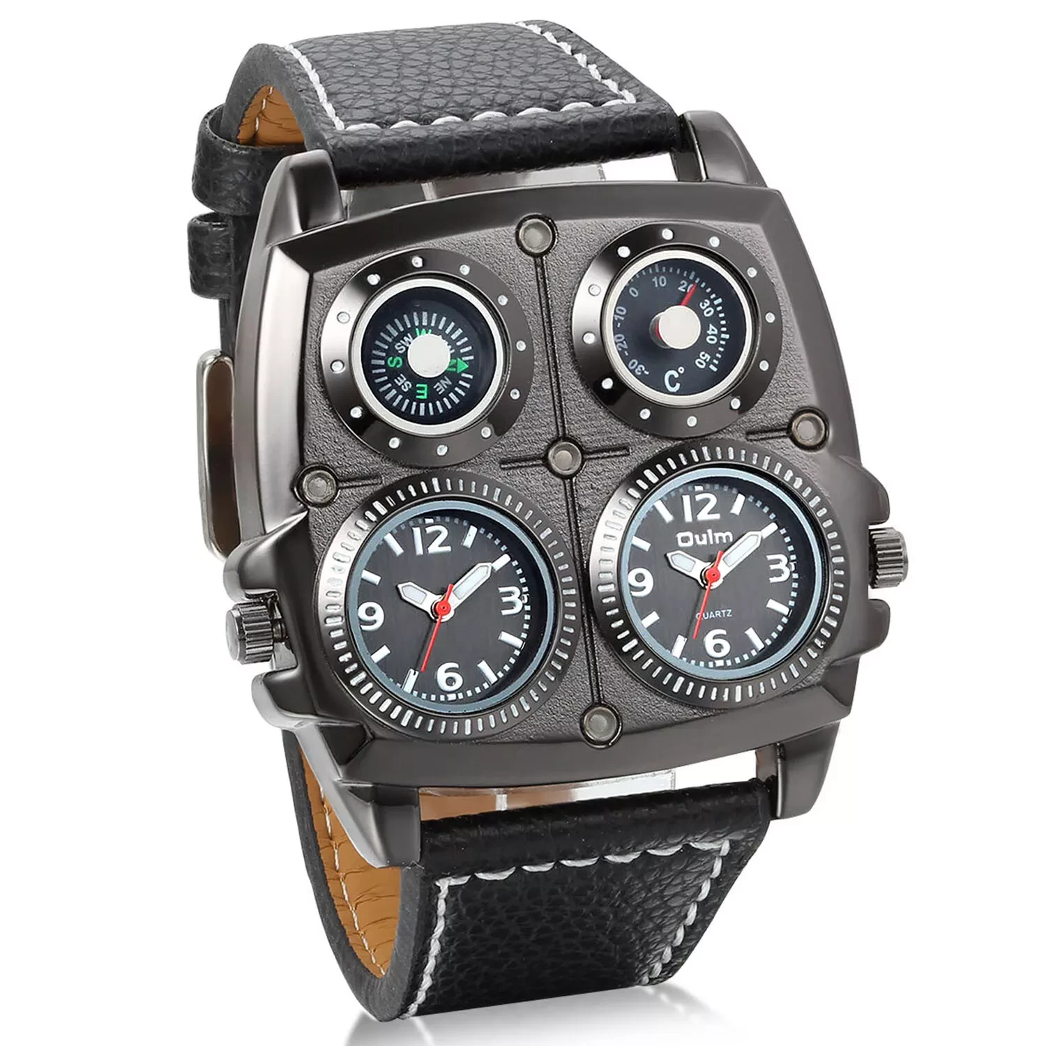 Military Army Dual Time Zones Movements Quartz Watch Black Leather Sports Mens