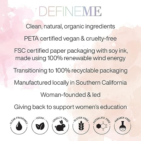 • DefineMe scents were created to connect you to the goddess within. Our fragrances are a wearable reminder of your self-love, creativity, gratitude, wanderlust, free-spiritedness, and strength. By understanding the connection between scent and emotion, we found divine-smelling fragrances to be a powerful way to help you embody that mold-breaking, barrier-crushing spirit within.