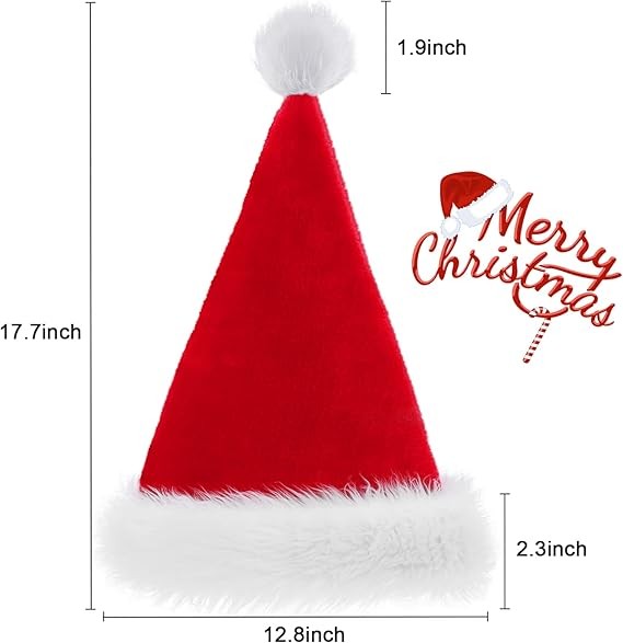 • ? Tips for Best Use: Due to transportation and packaging, the hat will be messy after opening the package, so you need to wash it by hand first and the fluffy effect will be restored after drying. Our hats are universal sizes and may be a little small for fatter heads. Santa Hat Size refer to recommendation: The red part is about ± 44 cm high and the cap The circumference of the hat is (Head circumference) approximately ±64 cm.
