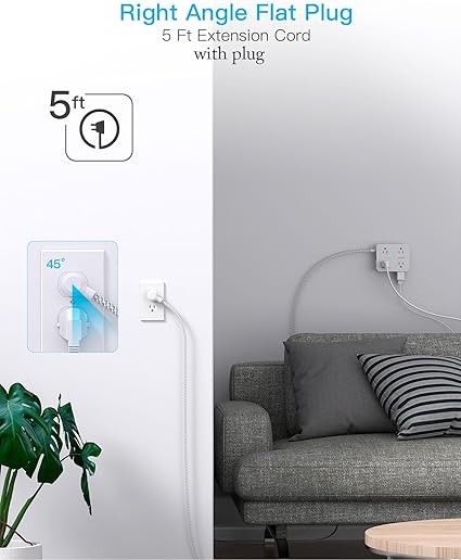 • 【Wall Mountable Extension Cord with Flat Plug】- The low-profile flat plug fits easily in tight spaces; and the right angle flat plug design prevents bottom plug blocking; the 5ft(included the plug) upgraded braided extension cord is very thick and has better current carrying capacity; the two mounting holes on back allows this power strip to be securely installed in various applications