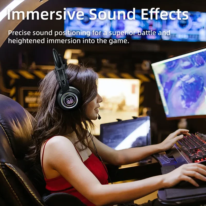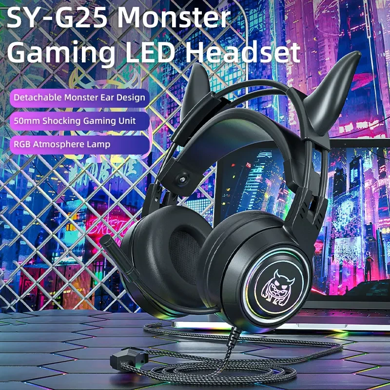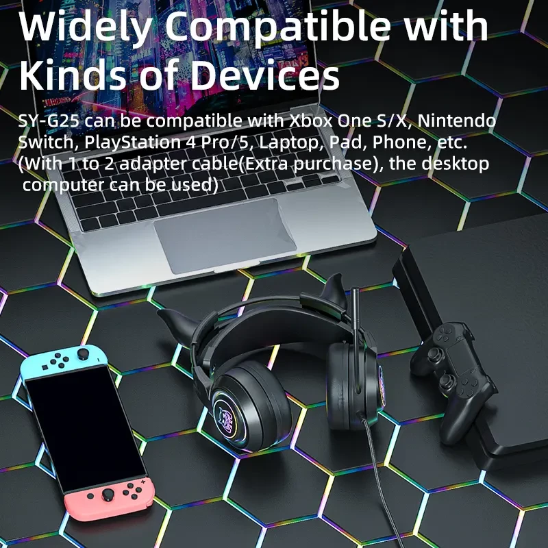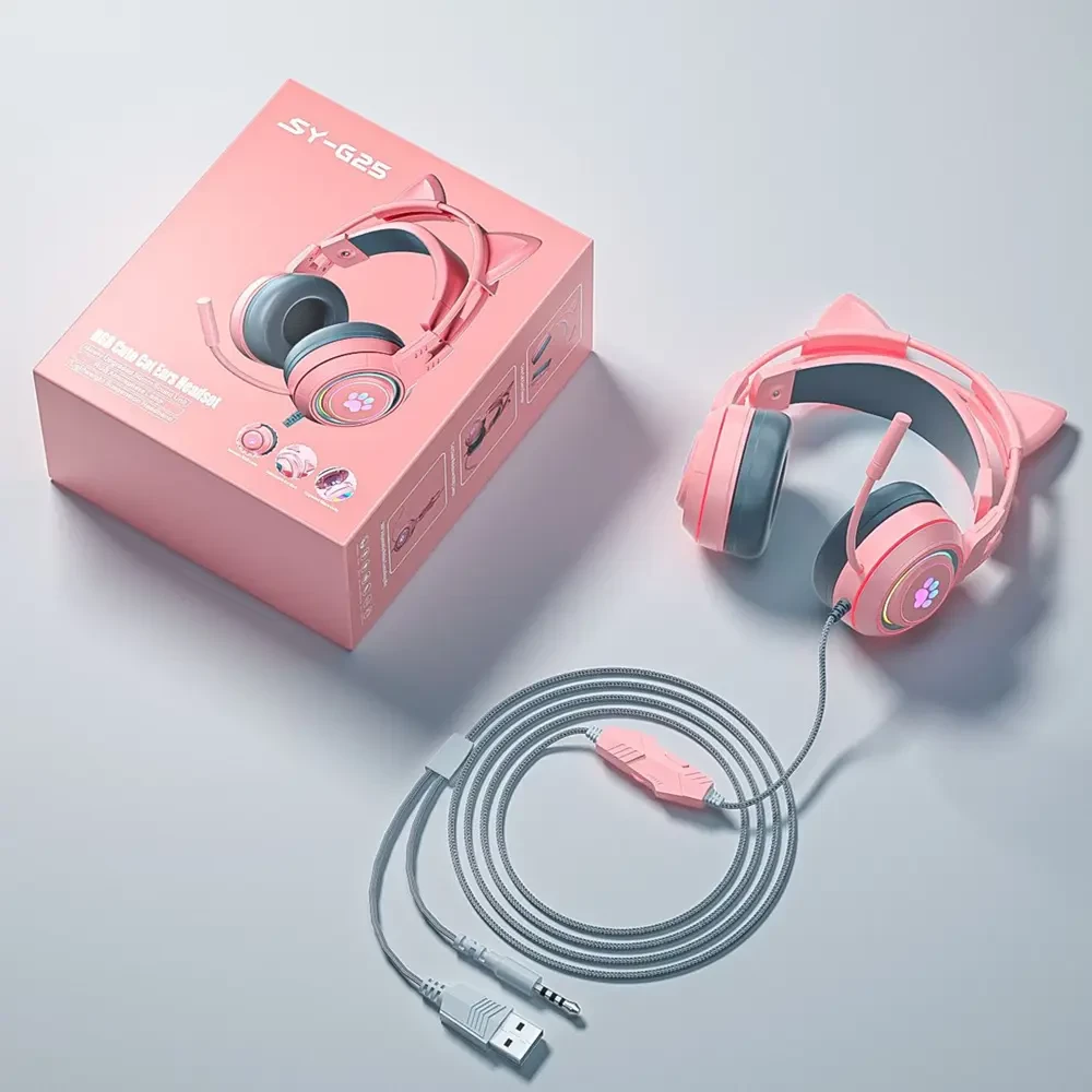 SY-G25 Wired Headphone RGB Lighting Omni-directional Mic Over-Ear Computer Headphone with Cute Cat Ear for E-sport