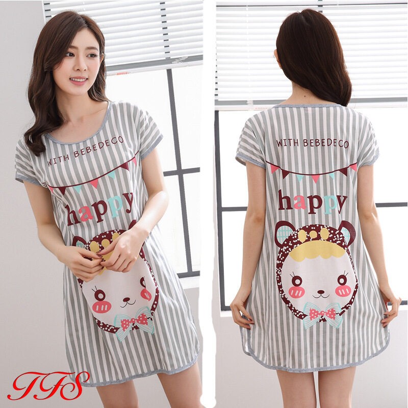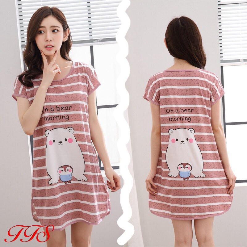 TFS Sleepwear for Women Short Sleeve Sleepwear Women Sleeping Dress Thin Cartoon Silk Pajamas Women