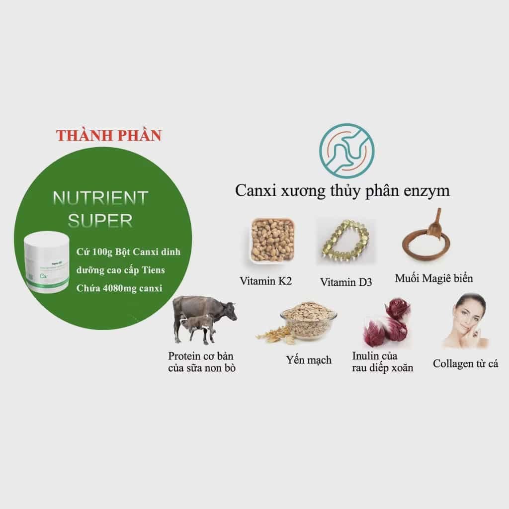 Thành phần chính: Bột canxi thủy phân enzyme, vitamin K2, D3, magie, protein từ sữa non bò, inulin, yến mạch, collagen.
